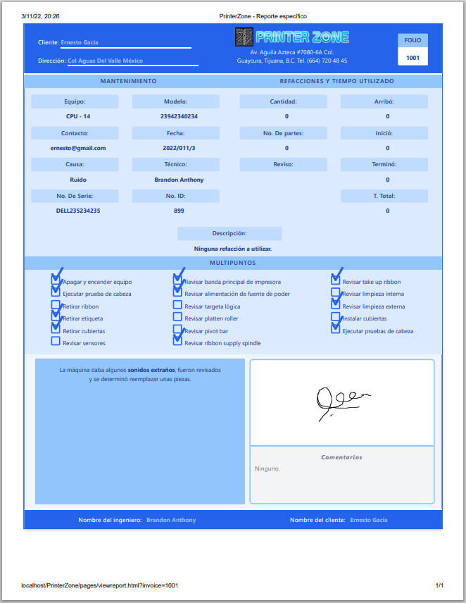 El ingeníero ingresa el nombre del cliente así como su propio nombre. También una firma digital de parte del cliente para dar la confirmación, pero se requiere de un bolígrafo para realizar la firma.